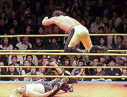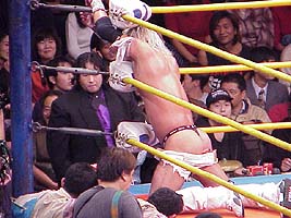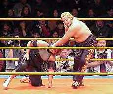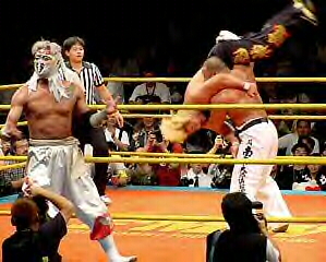 Mr. Gannosuke & Tetsuhiro Kuroda would team up on May 5, 2001 at Kawasaki Stadium to take on the team of Hayabusa & The Great Sasuke in a Exploding Octagon Cage Death Match. Hayabusa and Gannosuke would go right at it to begin the match, with both of them fighting to the outside of the ring, and Gannosuke already trying to throw Hayabusa head first into the exploding Octagon cage. Hayabusa would avoid the explosion, but would climb to the apron and jump at Gannosuke, but Gannosuke would manage to move out of the way, and already Hayabusa would be sent into the Exploding Cage. Kuroda and Sasuke would fight in the ring, and by the time Kuroda would manage to send Sasuke into the Explosions as well, Hayabusa and Gannosuke would be back in the ring going at it. Gannosuke would hit Hayabusa with his Riki Choshu lariat and then put Hayabusa in the Scorpion Death Lock. Kuroda and Gannosuke would double team on Hayabusa, dropping double elbows on Hayabusa, and then hitting Hayabusa with a Double Northern Lights Suplex, but would fail to put Hayabusa away despite the early beating Hayabusa had taken. Hayabusa would come back, and nail both Gannosuke and Kuroda with kicks to the head, and then would hit a Fisherman Buster on Kuroda before Gannosuke could make the save. Gannosuke would grab Hayabusa and deliver his Fire Thunder on Hayabusa, but would still not be able to put Hayabusa away after Sasuke would manage to make the save. Sasuke would throw Kuroda outside of the ring and then hit a tope con hilo on Kuroda, causing both of them to hit the exploding cage. Gannosuke would see his opportunity to try and finish off Hayabusa, and would attempt a Powerbomb, but Hayabusa would manage to reverse it into a hurricanrana. Hayabusa would charge Gannosuke, but Gannosuke would backdrop Hayabusa to the apron, and the two would begin attempting to throw each other into the cage with Irish Whips before both Hayabusa & Gannosuke would send each other into the cage together, causing not only an explosion from that side of the cage, but the entire Octagon Cage would explode afterwards. Dust would begin flying everywhere as all four wrestlers would be laid out. Sasuke and Kuroda would manage to be the first ones up, and Kuroda would take the advantage over Sasuke and deliver his Technan Buster DDT on Sasuke, but out of nowhere Hayabusa would manage to make the save before the three count. Gannosuke would manage to finally make it in the ring for an awaiting Hayabusa who would hit a Falcon Arrow on Gannosuke for a two count. Hayabusa would then try to hit Gannosuke with an H Edge, but Gannosuke would manage to resist it, and when Hayabusa would go for a Shotei on Gannosuke, Gannosuke would manage to turn it into a Gannosuke Clutch on Hayabusa for a two count. Hayabusa would manage to make it up before Gannosuke though, and would finally deliver the Shotei on Gannosuke, and then manage to lay Gannosuke out with a Fire Bird Splash. Hayabusa would then finally finish Gannosuke off with the H Thunder for the victory in his return at Kawasaki Stadium. It would be a huge loss for Team Kuroda.