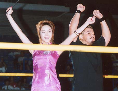 Mr. Gannosuke & Mammoth Sasaki would defend their WEW Tag Team Titles against Hayabusa & Tetsuhiro Kuroda on October 9, 2001 at Korakuen Hall, but Gannosuke would have to worry about something else going into his match, and Mirei would be found crying in the backstage by Tetsuhiro Kuroda, after hearing about Gannosuke being with another woman. Mirei would confront Gannosuke before the match, with Gannosuke denying allegations of being with another woman, when a woman by the name of MAKIKO would come out from the crowd to confront Mirei and tell her that she's been with Gannosuke, and that she was going to stay with Gannosuke, and for her to hit the road. Mirei and MAKIKO would begin to get in a shoving fight until Yoshida would force both of them to the back for the match to begin. Hayabusa would jump Gannosuke right away, and hit a flying tope con hilo right at the start of the match. Kuroda would also mock Gannosuke, by hitting his own version of the Riki Choshu Lariat, and then putting Gannosuke in the Scorpion Death Lock. Both Gannosuke and Mammoth would begin focusing on Hayabusa's knee, including putting Hayabusa in one legged crabs, as well as Gannosuke putting the Scorpion Death Lock on Hayabusa, and then followed by Mammoth putting a chair over Hayabusa's injured knee, and again putting him in a one legged crab. Hayabusa would manage to fight back on Gannosuke and would deliver an H Edge, followed by a H Thunder, and then a Fire Bird Splash on Gannosuke, Mammoth would come in and hit Hayabusa with the Rydeen Bomb on Hayabusa. Gannosuke would follow with a Fire Thunder on Hayabusa, and would continue working on Hayabusa's leg, before tagging in Mammoth. Mammoth would hit a Chokeslam on Hayabusa, but Kuroda would quickly make the save. Gannosuke would make sure to clear the ring of Kuroda, with Mammoth going for another Chokeslam, but when going down, Hayabusa would be able to roll up Mammoth for the victory, with Mr. Gannosuke losing his second title in one month. It was not a good day for Mr. Gannosuke, but the next Korakuen Hall event would not be horrible for Masashi Honda, and everyone involved in FMW.