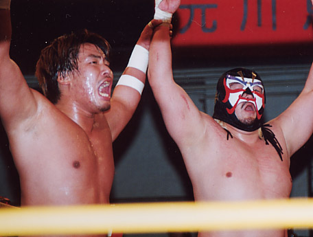 Mr. Gannosuke would team up with Jinsei Shinzaki for the first time, and it would be the first time the two had made any contact with each other since their feud in 1998 while teaming with Kodo Fuyuki on July 28, 2000 at Korakuen Hall. Hayabusa and Hisakatsu Oya would reveal their partner days before the show to be returning Masato Tanaka, who had not wrestled in FMW since his lost to Hayabusa. Gannosuke and Shinzaki would work well as a team together, with Shinzaki even allowing Gannosuke to hit his own Praying Powerbomb on Hayabusa. Gannosuke & Shinzaki would hit identical spots the Hayabusa & Shinzaki tag team ha perfected before Gannosuke and Shinzaki were about to send Hayabusa into the ropes, when Shinzaki would pull Gannosuke back and to a loud reaction from the crowd, hit a standing Moonsault and land a kick to the head of Gannosuke. Hayabusa & Jinsei Shinzaki were back as team mates as Gannosuke would have to be the one to suffer as a result. Hayabusa & Shinzaki would hit their double signature Asai Moonsaults on Gannosuke before Hayabusa would finally manage to finish Gannosuke off with a Fire Bird Splash for the victory.