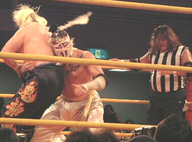To try and make sure that Hayabusa would not be healthy for his big return, a Team Kuroda member would run down Hayabusa in a motorcycle, running over his foot and kidnapping him. Kuroda & Gannosuke would do their best to bug and irritate The Great Sasuke by peaking their head through his locker room door and making fun of him during his interview. Mr. Gannosuke would have his first match back since his November 12, 2000 lost to Tetsuhiro Kuroda on April 15, 2001 at Korakuen Hall, with the building looking more lively and more filled with Mr. Gannosuke returning, and Hayabusa on his way back. Mr. Gannosuke would team with fellow Team Kuroda members Tetsuhiro Kuroda & Mammoth Sasaki to take on The Great Sasuke, GOEMON, and Onryo. The Great Sasuke would attack Gannosuke right at the start of the match, sending him out of the ring, and hitting a tope con hilo landing right on Gannosuke on the outside. Gannosuke would be tagged in eventually and the first thing he would do when coming back would be hit his tribute to Riki Choshu Lariat on The Great Sasuke and then place him in the Scorpion Death Lock. Kuroda would take over on the beating on Sasuke, as the two would begin brawling in the crowd, but when returning, The Great Sasuke would get the advantage and attempt to hit a Powerbomb on Kuroda, but Gannosuke would manage to make the save, and would attempt to hit the Fire Thunder on The Great Sasuke, but Sasuke would manage to break away and quickly tag GOEMON in. GOEMON would duck a clothesline by Gannosuke, but when coming back, Gannosuke would manage to hook the Gannosuke Clutch on GOEMON for a two count, and then followed with a Fire Thunder. Kuroda would manage to eventually put away Onryo with his Technan Buster DDT for the pinfall victory over Onryo. Team Kuroda would continue to attack the beaten Great Sasuke when Hayabusa's "Fight with Dream II" would begin playing, but instead of Hayabusa coming out to make the save, it would be Team Kuroda bringing an injured Hayabusa to the ring to beat on more. Team Kuroda would beat on Hayabusa & The Great Sasuke with Gannosuke pulling off Sasuke's mask and putting it on himself as Hayabusa & The Great Sasuke would lay there until Team Kuroda would finally leave. Hayabusa would finally get up with The Great Sasuke having to stay down with his face on the mat without letting the fans see his face, as Hayabusa would declare revenge on Tetsuhiro Kuroda & Mr. Gannosuke for his return on May 5th at Kawasaki Stadium.