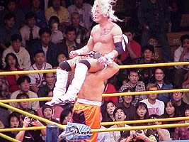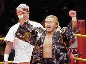 H & Mr. Gannosuke would defend the WEW Tag Team Titles for the second time on February 25, 2000 at Korakuen Hall against Kodo Fuyuki & Kyoko Inoue. H & Gannosuke would have the early advantage of Kyoko's lack of size with Gannosuke hitting Kyoko with a Powerbomb, and H hitting her with a Fire Bird Splash. Gannosuke would then catch Kodo Fuyuki on the top turnbuckle, and all hell would break loose as Gannosuke would attempt to Fire Thunder Fuyuki, but Fuyuki would break loose, and Gannosuke would charge Fuyuki with a lariat but with Fuyuki ducking out of the way, Gannosuke would accidentally hit the referee. Fuyuki would charge at Gannosuke, but Gannosuke would catch him and put Fuyuki in the Gannosuke Clutch, but there would be no referee to make the count. Gannosuke would then climb the top turnbuckle, when Chocoball Mukai in a ECW Japan shirt would kick Gannosuke off the top turnbuckle. Fuyuki would charge at Gannosuke, but Gannosuke would again catch Fuyuki's charge and attempt to put another Gannosuke Clutch on Fuyuki, but Fuyuki would get behind Gannosuke and with the referee now up, Fuyuki would roll Gannosuke up for a Samson Clutch and the pinfall victory over Gannosuke for the WEW Tag Team Titles.