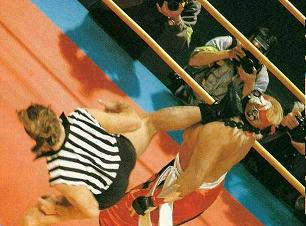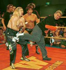 Mr. Gannosuke, Kintaro Kanemura & Shoichi Arai would team up against Hayabusa, GOEMON, and Onryo on July 2, 2001 at Korakuen Hall with Kodo Fuyuki as the Special Referee, with Shoichi Arai losing. Mr. Gannosuke would debut to the crowd his new girlfriend the beautiful Mirei to the crowd. The match would start with GOEMON attempting to save Arai from any of the stress, and would lay down and offer Arai to pin him right away, causing Gannosuke & Kanemura to make the quick save from allowing their partner to win just like that. GOEMON not knowing what to do, not wanting to hurt Arai, would tag in Hayabusa. Hayabusa would come in, and as Arai would go for the tag, Gannosuke and Kanemura were down the tag. Hayabusa would lay one punch Arai to the ground, disgusting Gannosuke & Kanemura so much that Kanemura would finally be tagged in. Gannosuke & GOEMON would both be tagged in, and Gannosuke would hit GOEMON with a bulldog, and then mock Hayabusa by using the old Hayabusa & Shinzaki mannerism after they would hit a double bulldog, but this would leave GOEMON open to get up and put Gannosuke in a stretch plumb with GOEMON rolling up Gannosuke for two. Hayabusa & Onryo would then come in the ring and triple team on Gannosuke, with Onryo being left in the ring. Gannosuke would quickly hit a lowblow on Onryo, and Gannosuke & Kanemura would go to take care of Hayabusa & GOEMON, Shoichi Arai would go over and see if Onryo was okay, which he would get kicked by Referee Kodo Fuyuki as a result. Gannosuke would also kick Arai, when Gannosuke's girlfriend Mirei would come in the ring and with Gannosuke holding Hayabusa, bring a chair in the ring and hit Hayabusa over the head with it. Gannosuke would begin brawling with Hayabusa in the crowd, when Kanemura would begin working over Onryo. Gannosuke would come back in the ring, and the two would do their trademark Team No Respect kiss and then double elbow Onryo. Kanemura would then grab Arai, and force Arai to do the same thing with him, dropping the double elbow on Onryo. Gannosuke would hit Onryo with his Riki Choshu Lariat and then put Onryo in the Scorpion Death Lock. Gannosuke would then tag Arai, and force him to fight the injure Onryo. Kanemura would come in with a chair, but instead of hitting Onryo with it, would just begin to smash the chair over Arai. Hayabusa would begin going at it with Gannosuke, sending Gannosuke to the outside with a Hurricanrana and then hitting an Asai Moonsault on the outside to Gannosuke. GOEMON would come in and roll up Kanemura with the Gannosuke Clutch, but Referee Kodo Fuyuki would refuse to count. Kanemura would climb to the top rope with Gannosuke handing him a chair, but when Kanemura would come off the turnbuckle, GOEMON would move out of the way, and instead Kanemura would knock out Fuyuki with the chair. Gannosuke would come in and hit GOEMON with a Praying Powerbomb with Fuyuki getting up and attempting a quick count, but still not being able to get to three. Gannosuke would setup for the Fire Thunder on Gannosuke, but GOEMON would manage to break free and send Gannosuke flying into Fuyuki in the corner, once again knocking Fuyuki down. Hayabusa would come in and hit Gannosuke with the Falcon Arrow, but there would be no Fuyuki to even attempt to count. But when Hayabusa would begin charging after Gannosuke, Gannosuke would catch him and put Hayabusa in the Gannosuke Clutch, with Fuyuki getting up and attempting a quick count, but still not quick enough. Hayabusa would get up and begin to argue with Fuyuki, and would get slapped by Fuyuki as a result, but it would turn Hayabusa around to see Gannosuke charging at him, and Hayabusa would hit Gannosuke with the H Edge. Hayabusa would then hit Gannosuke with the Fire Bird Splash, and cover Gannosuke, but Fuyuki would only go to count for two until FMW Referee Marty Asano would rush to the ring and hit Fuyuki's hand down for three to give the victory to Hayabusa. It would be the last time that Hayabusa would pin Gannosuke again. As a result of Hayabusa's team still managing to win, Kodo Fuyuki would make a match for July 20, 2001 at Korakuen Hall, with Fuyuki teaming with Gannosuke, Kanemura, and FMW Vice President Senmu Yoshida to face Hayabusa, Tetsuhiro Kuroda, Azusa Kudo, and Shoichi Arai.