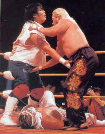 Mr. Gannosuke would carry a tied up Ricky Fuji and wheel him in to the forests where Mr. Gannosuke would blow up Ricky Fuji if H's team were to lose. Gannosuke would stand by Ricky Fuji the entire night, with dynamite attached and threaten to blow up Ricky after Ricky would begin talking back to him during the night. H would manage to defeat Kodo Fuyuki & GOEMON on June 16, 2000 at Korakuen Hall after Genichiro Tenryu would rush to the ring to help the bloody and injured H, and Powerbomb Fuyuki, setting up H to hit the Fire Bird Splash on Fuyuki for the pinfall victory. But after the victory, the FMW tron would show a huge explosion at the sight of where Gannosuke and Ricky Fuji were. The show would end with nobody knowing if Ricky Fuji had just survived the blast. Also, on the show, Kintaro Kanemura would officially end Team No Respect after two and a half years and join Shin Fuyuki-gun.