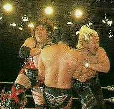 The team of Mr. Gannosuke, Kintaro Kanemura, and Kodo Fuyuki would then manage to score the WEW 6 Man Tag Team Titles on July 30, 2001 at the Fukouka Hakata Star Lanes, by defeating the team of Hisakatsu Oya, Ricky Fuji, and Flying Kid Ichihara for the titles after Gannosuke would pin former IWA friend Flying Kid Ichihara with a Fire Thunder for the titles. Gannosuke, Kanemura, and Mammoth Sasaki would face off against Hayabusa, GOEMON, and Onryo on August 3, 2001 at Korakuen Hall, but before their match, Azusa Kudo attempting to have a reverse sex change, would end up being given the DNA of a Spider and turn into Biomonster DNA, with DNA attacking Arai, and almost giving Fuyuki a heart attack in the mean time, knowing he would now have to face a Monster on August 11th. Gannosuke's team would begin focusing on attempting to beat the much smaller Onryo, with Gannosuke hitting his Riki Choshu Lariat on Onryo, as well as putting him the Scorpion Death Lock. Kanemura would also hit Onryo with a Thunder Fire Powerbomb, and when Hayabusa would come to make the save for Onryo, Gannosuke would hit Hayabusa with a Fire Thunder, spiking Hayabusa incredibly hard, almost knocking him out, with Kanemura following with a Thunder Fire Powerbomb on Hayabusa to score the pinfall victory over Hayabusa.