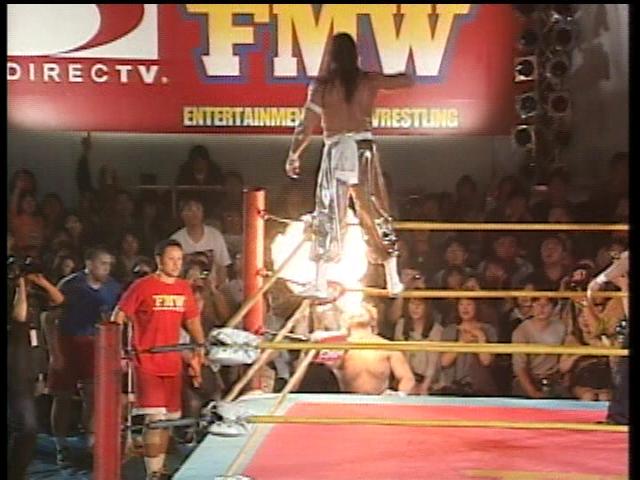 Mr. Gannosuke would team with Kodo Fuyuki, Kintaro Kanemura, and Senmu Yoshida on July 20, 2001 at Korakuen Hall to face Hayabusa, Tetsuhiro Kuroda, Azusa Kudo, and Shoichi Arai. Gannosuke and Kuroda would go at it right away, before the two would begin fighting all the way to the back, clearing the crowd while attacking each other with chairs. With all eight wrestlers brawling around ringside, it would finally be calmed down with Gannosuke and Shoichi Arai going at it in the ring. Gannosuke would hit his Riki Choshu Lariat on Arai, and then put Arai in the Scorpion Death Lock before Hayabusa would make the save. Gannosuke and Kudo would begin going at it, with Kudo getting Gannosuke in the stretch plumb, with Gannosuke's girlfriend Mirei swatting at Kudo to break the move. Kudo would head butt Mirei for her troubles as a result, and then hitting a leg drop on her, with Gannosuke throwing Kudo out of the ring, and try to help his girlfriend back up. Kuroda and Gannosuke would begin brawling into the crowd once again, with Kuroda hitting his running lariat through the crowd. Gannosuke would come back on Kuroda with his Riki Choshu running lariat on Kuroda in the crowd, and then put Kuroda in the Scorpion Death Lock in the aisle of the crowd. A triple team of Gannosuke, Kanemura, and Fuyuki would begin brutalizing Azusa Kudo, before he could make the desperate tag to Hayabusa, who would begin going at it with Gannosuke. Hayabusa would hit an Asai Moonsault on Gannosuke to the outside, but when attempting his Asai Moonsault, Gannosuke would manage to get his knees up in the air in time. Gannosuke would then take the opportunity once again to hit Hayabusa with the Fire Thunder. Kudo would be tagged in, but once again would be met with a triple team, with Fuyuki hitting a Charging Lariat, Gannosuke hitting a Fisherman Suplex, and Kanemura using multiple chairs, including a Thunder Fire Powerbomb on the chairs, before Kanemura would finish Kudo off with a senton on the stack of chairs for the win. After the match, it would be announced that the ownership of FMW would be on the line at the upcoming August 11, 2001 Komazawa Olympic Gym show with the best of three matches deciding whether Kodo Fuyuki or Shoichi Arai would own FMW. Kodo Fuyuki would take on Azusa Kudo, Mr. Gannosuke would face Tetsuhiro Kuroda, and Hayabusa would defend the WEW World Title against Kintaro Kanemura.